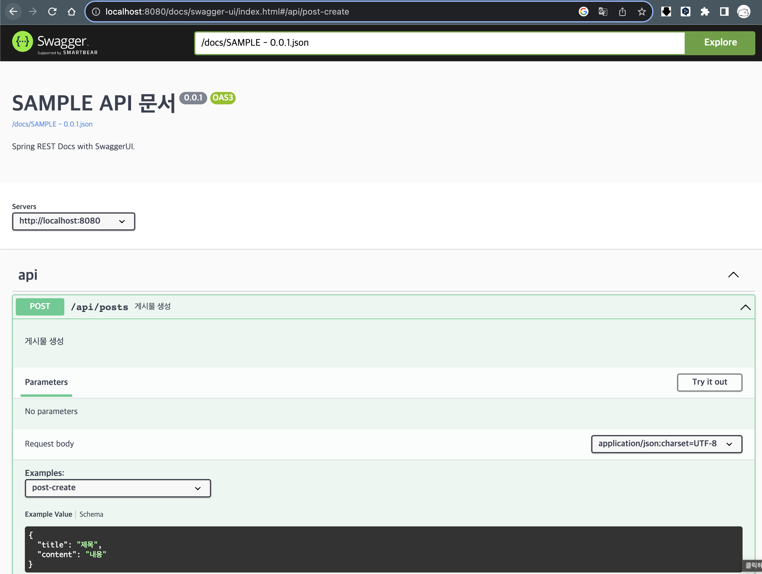 Swagger의 기본 경로를 수정해 준 뒤 서버를 실행하고 http://localhost:8080/docs/swagger를 접속하면 문서를 확인 할 수 있다.