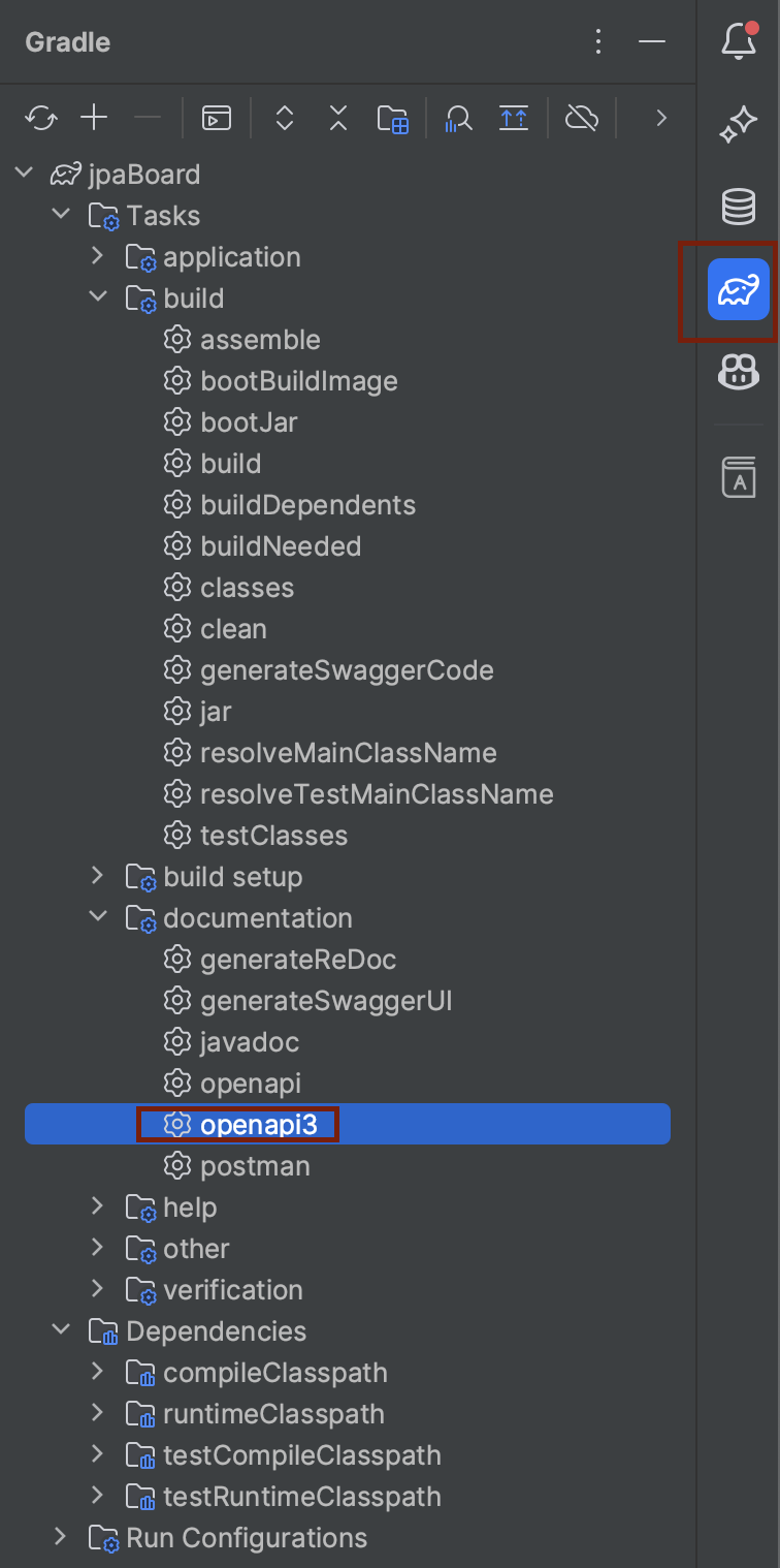 테스트코드의 작성을 마쳤으면 제대로 동작하는지 확인 후 gradle 태스크에서 openapi3 를 실행해 문서를 생성합니다.