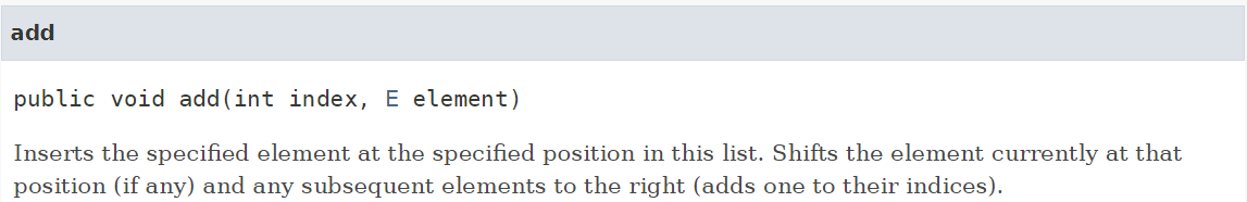 - 두 번째 메서드는 목록에 지정된 위치의 인덱스에 요소를 삽입한다. 시간 복잡도는 O(n)이다. 지정된 위치에 노드가 이미 있다면 연결된 노드를 끊고 다시 연결된다(노드가 하나씩 오른쪽으로 이동한다고 생각하자).