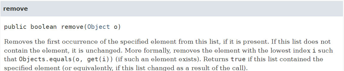 - 두 번째 메서드는 매개변수로 요소를 받아 지정된 요소를 탐색한 뒤 지정된 요소를 삭제하면 true를 반환한다. 지정된 요소로는 null 또한 가능하다. 시간 복잡도는 O(n)이다.