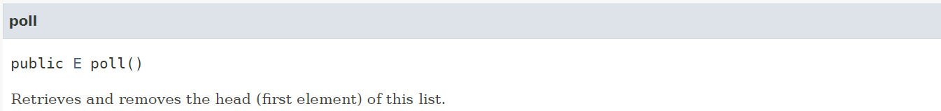 - poll() 은 첫 번째 요소를 반환한 뒤 제거한다. 만약 빈 list라면 null을 반환한다.